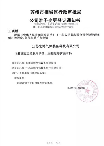 為適應(yīng)市場(chǎng)經(jīng)營(yíng)和公司發(fā)展需要,2019年11月20日,經(jīng)蘇州市相城區(qū)行政審批局核準(zhǔn),原“蘇州宏博凈化設(shè)備有限公司”正式變更登記為“江蘇宏博氣體裝備科技有限公司”。